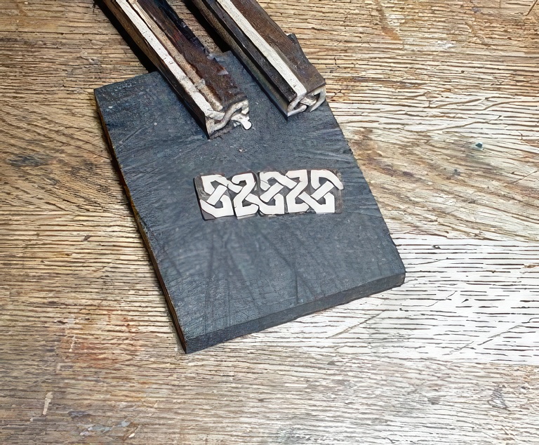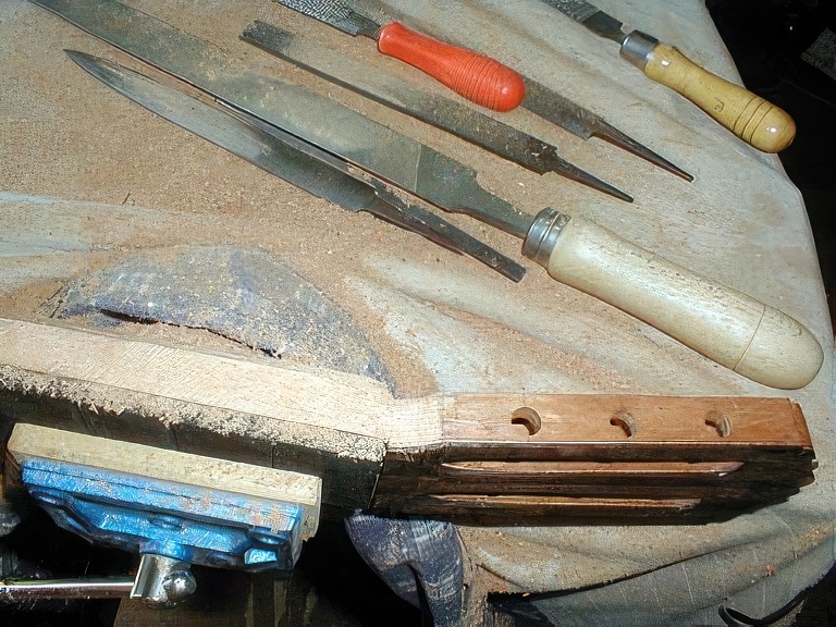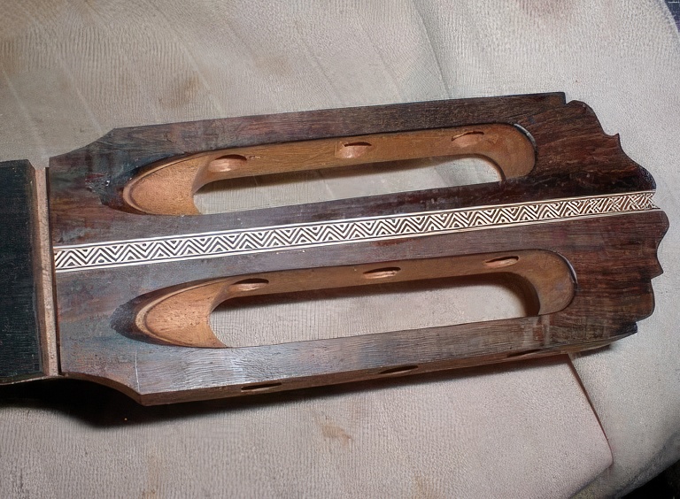 ネックの形状削り出しとその間にヘッドに入れる象嵌を製作しています。ここからどのような細工になるかお楽しみに。
