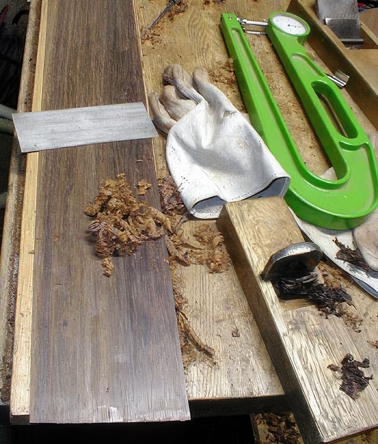側板の厚みだしをしています。2枚刃の鉋、立ち台鉋、スクレーパーを使ってカリパスで測りながらの作業です。スクレーパーを使用時に出る摩擦熱と削り台などのささくれから手を保護する為革手袋を使ってます。明日は側板を曲げる予定です。
