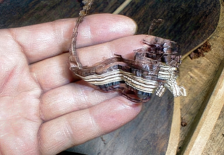 口輪ロセッタを加工中、こう見えて工程が複雑なのです。ドットパターンのモザイクではなく、箱根細工と同様の、木組みで製作。加工精度が求められますが、出来上がりが主に木口面を使い点描のドットパターンよりもシャープに仕上がります。