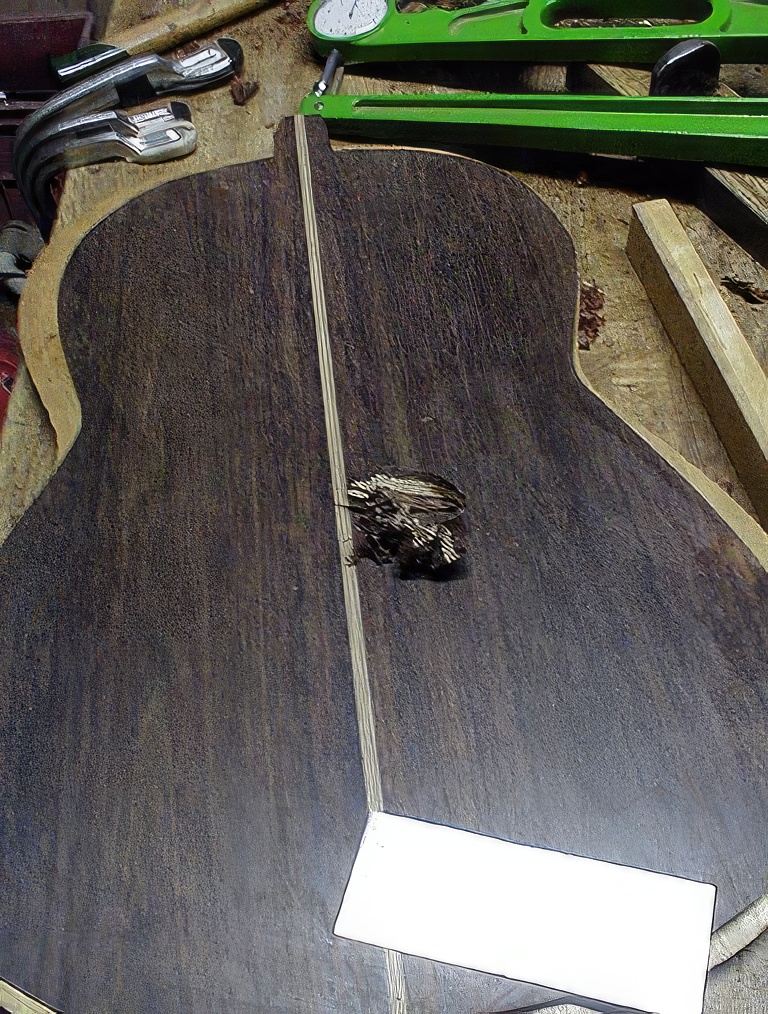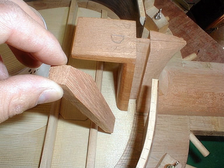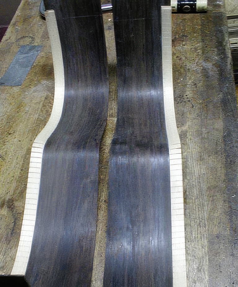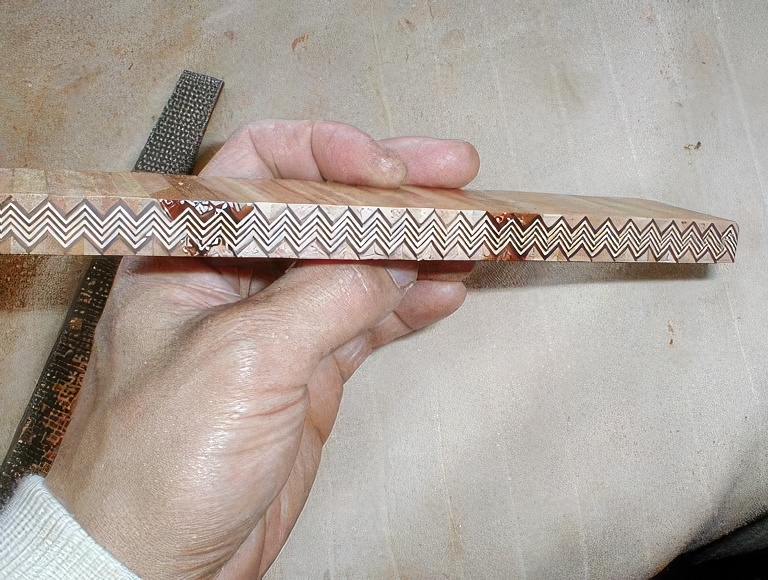指板の加工中です。表面板と指板の接点付近で表面板の割れが起きやすいのですが、これは指板材の黒檀と表面板材の松あるいは杉の乾燥・膨張の収縮率のちがいから起こる故障です。表面板に接する指板の裏側に収縮を押さえる為に木目方向を変えた黒檀を埋め込んでいます。これはハウザーやオーストリアの製作者の一部に取り入れられている方法です。