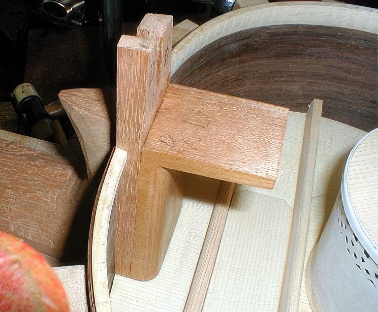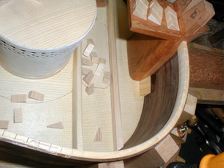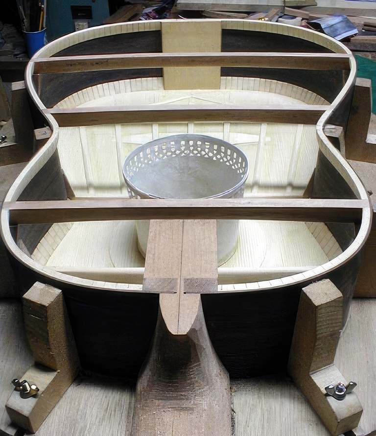 表面板とネックを接合後、組み立て台座に乗せ側板を組み合わせる段階です。ネックと側板はロマニリョスの方式であるスロット方式を採用しました。側板を楔で固定する事で側板の割れを防ぐと同時に、遊びがなく正確に取り付けれれます。アリ継ぎ式以上にスペイン棹方式は強度があるのですが、さらに楔で固定してしまうこの方式は理想的です。