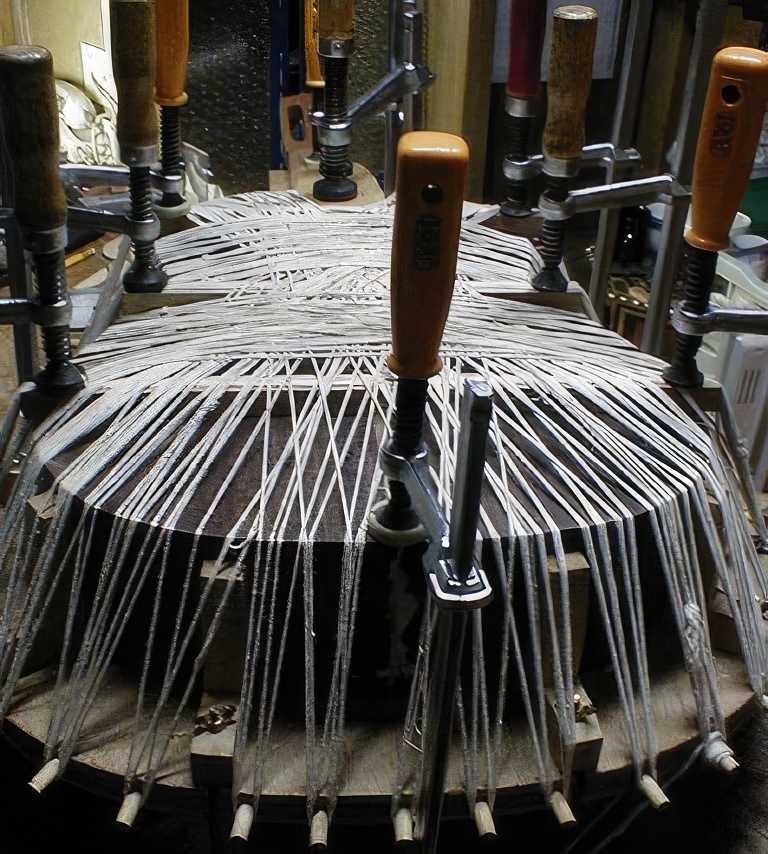 裏板のトランスバーを接着後、裏板を接着。裏板の接着は紐で巻きます。