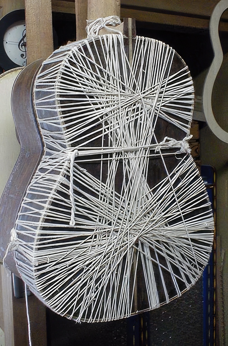 駒接着しました。スペイン式にロープを使用して膠で接着します。このロープはマリーン師からいただきました。太さもちょうど良く、蜜ロウでかためられていて食いつき感、伸びがあります。現在多くの工房では金属性のクランプが使用されますが、片側をサウンドホールから挿入して上部で締めるのですが、クランプを3本使いクランプの自重から歪みがでて接着されるので理想的ではないでしょう。もっともトルナボス装着の場合ロープでしか接着出来ません。