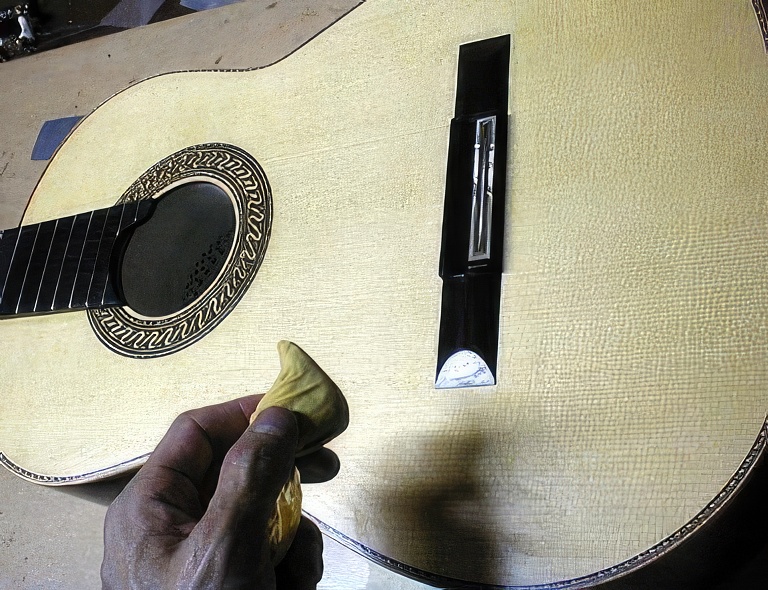 久しぶりの更新です。セラックニス塗装の最終仕上げ中。手に持っているタンポでアルコールに溶かしたセラックを塗り込みます。合成塗料のようにガン吹きでなく手作業で塗装するので、熟練と時間が必要。